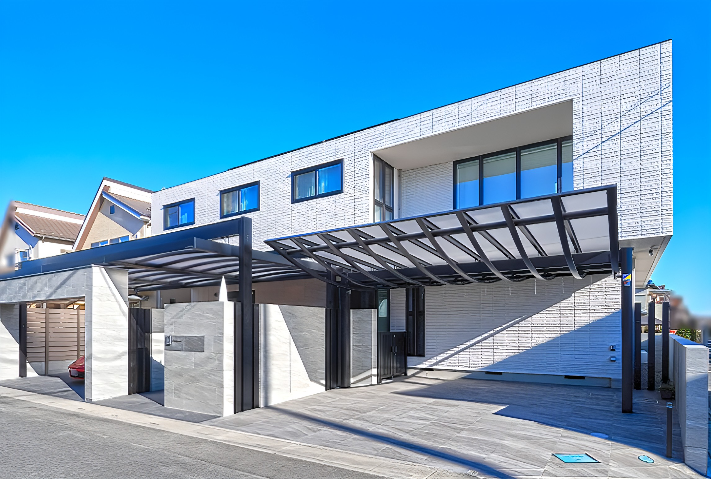 エントランス周辺を門塀でしっかりと囲い、ゲスト用スペースにはオープンなカーポート「 エアロシェード 」を設置し、開放感も演出しました。