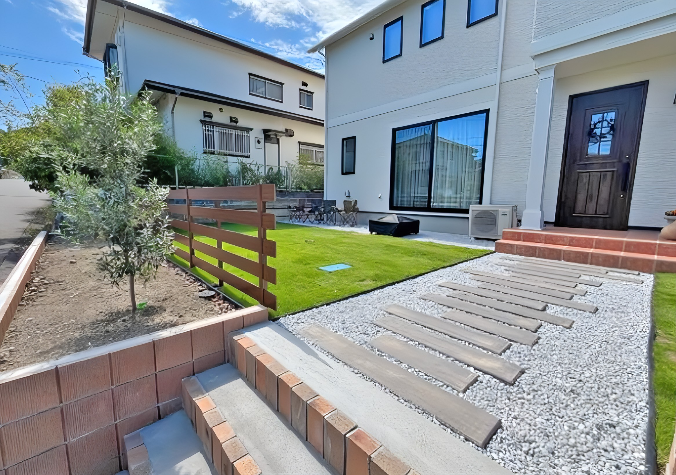 神奈川県横須賀市のM様邸では、高低差のある敷地を活かしながら、自然素材を取り入れた開放的な外構をご提案しました。